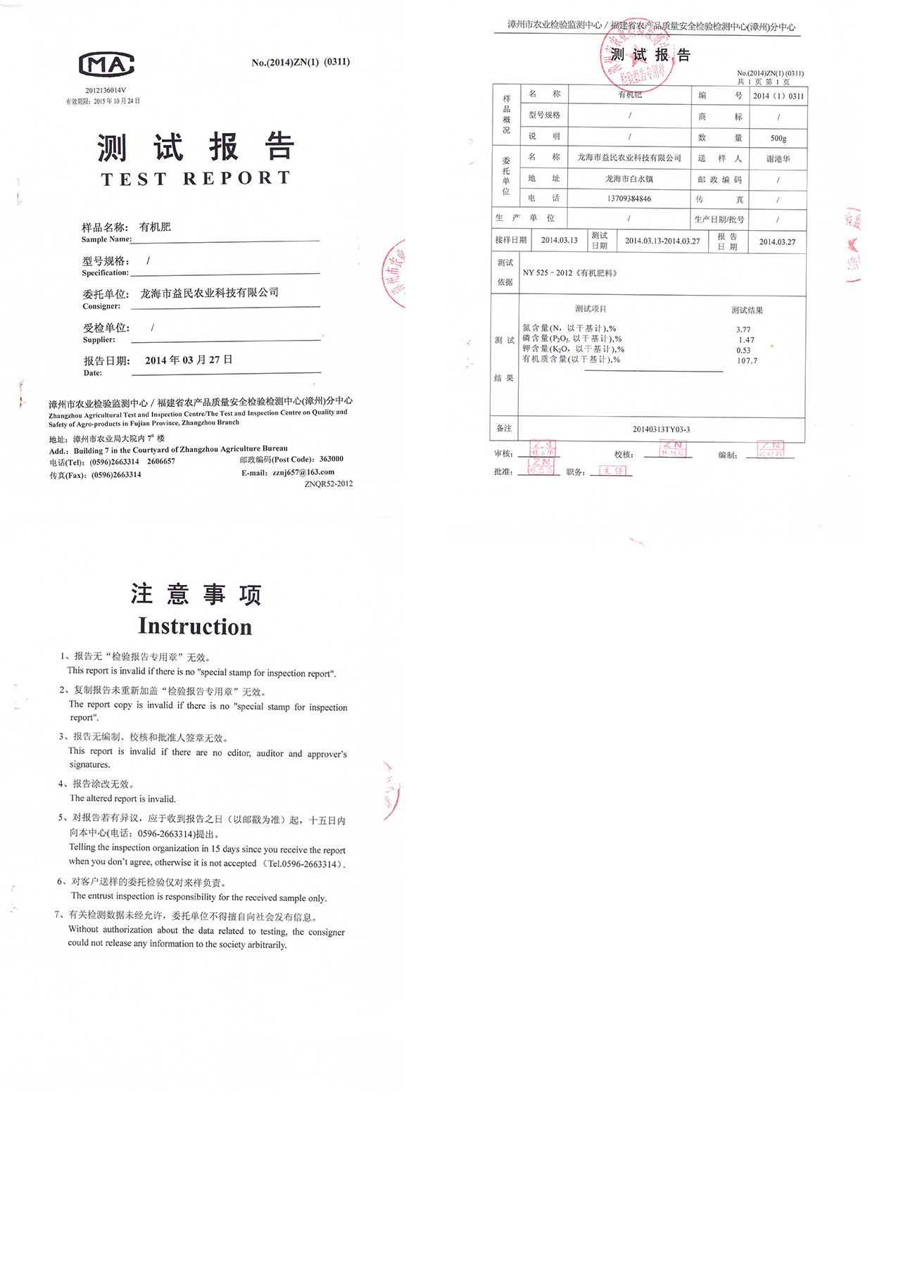 漳州市農(nóng)業(yè)檢驗檢測中心測試報告 有機(jī)肥2