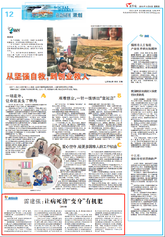 2019年9月5日,福建省委機(jī)關(guān)報(bào)《福建日報(bào)》發(fā)布題為“讓病死豬'變身'有機(jī)肥”的新聞報(bào)道,將我司雷建強(qiáng)總經(jīng)理主導(dǎo)研發(fā)病死豬無害化設(shè)備的創(chuàng)業(yè)故事作為雙創(chuàng)代表的先進(jìn)事跡進(jìn)行宣傳報(bào)道。具體報(bào)道內(nèi)容如下: